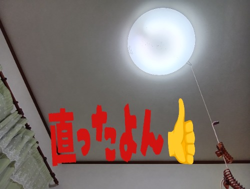 私の部屋の照明は2つあります。先日、片方の照明のヒモが壊れて、部屋の半分が暗かったんですが直ってました。