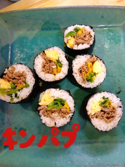 巻キスを捨てちゃったから、厚紙+ベーキングペーパー+アルミホイル(笑)で作ったキンパプ