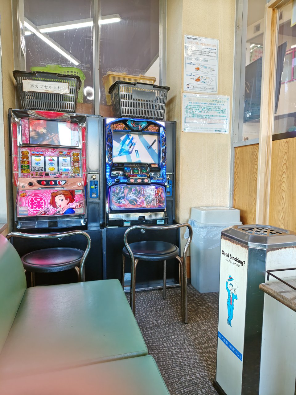 というわけで、ここやっぱりどこ見ても汚くて背筋がゾワゾワしてくるけど浸かってるだけで肌つるっつるになるからええわあ、とか思いながらそれなりに満足しつつひとっ風呂浴びたあとは、脱衣場の喫煙所で水分補給という名の一服。