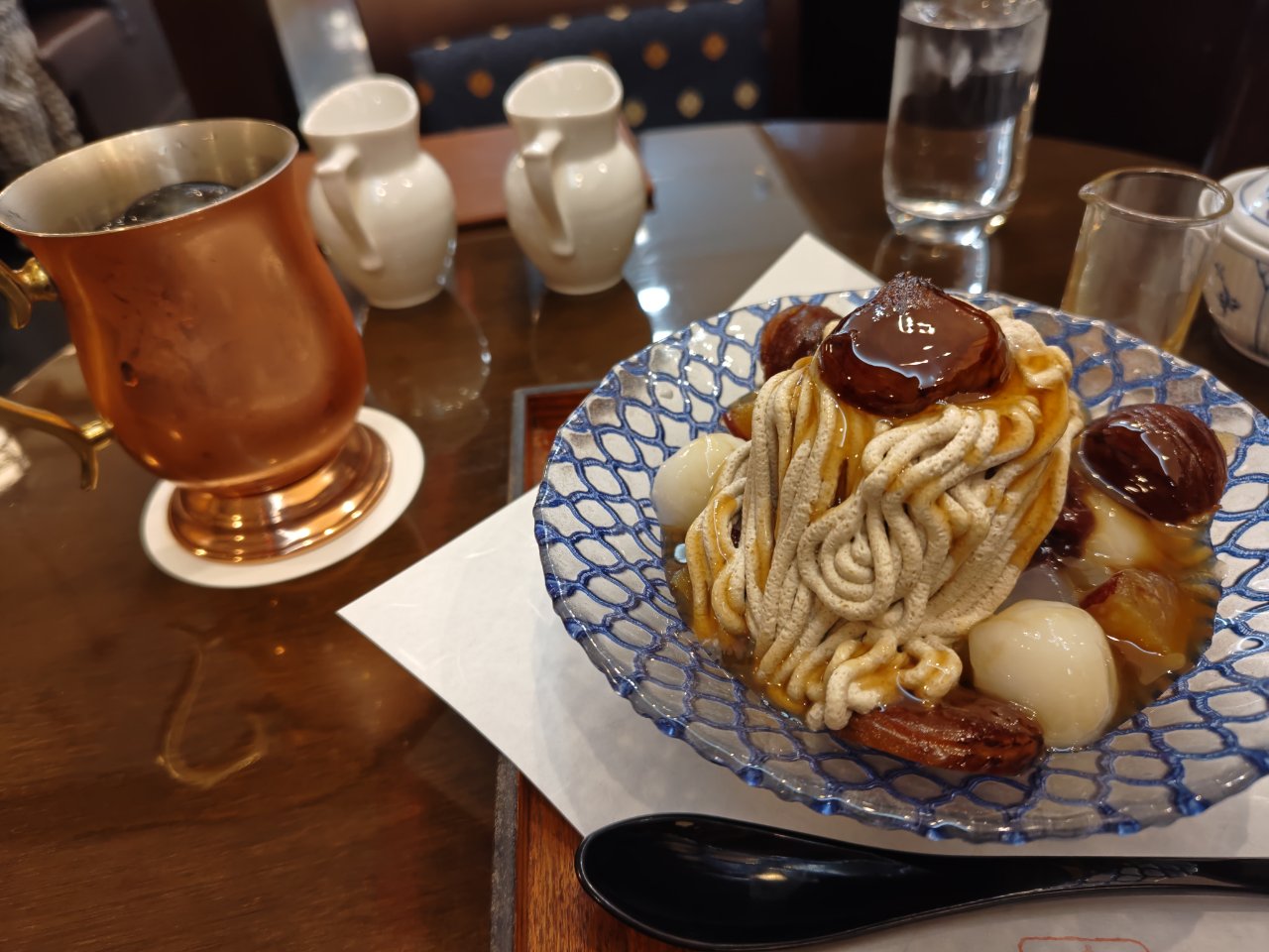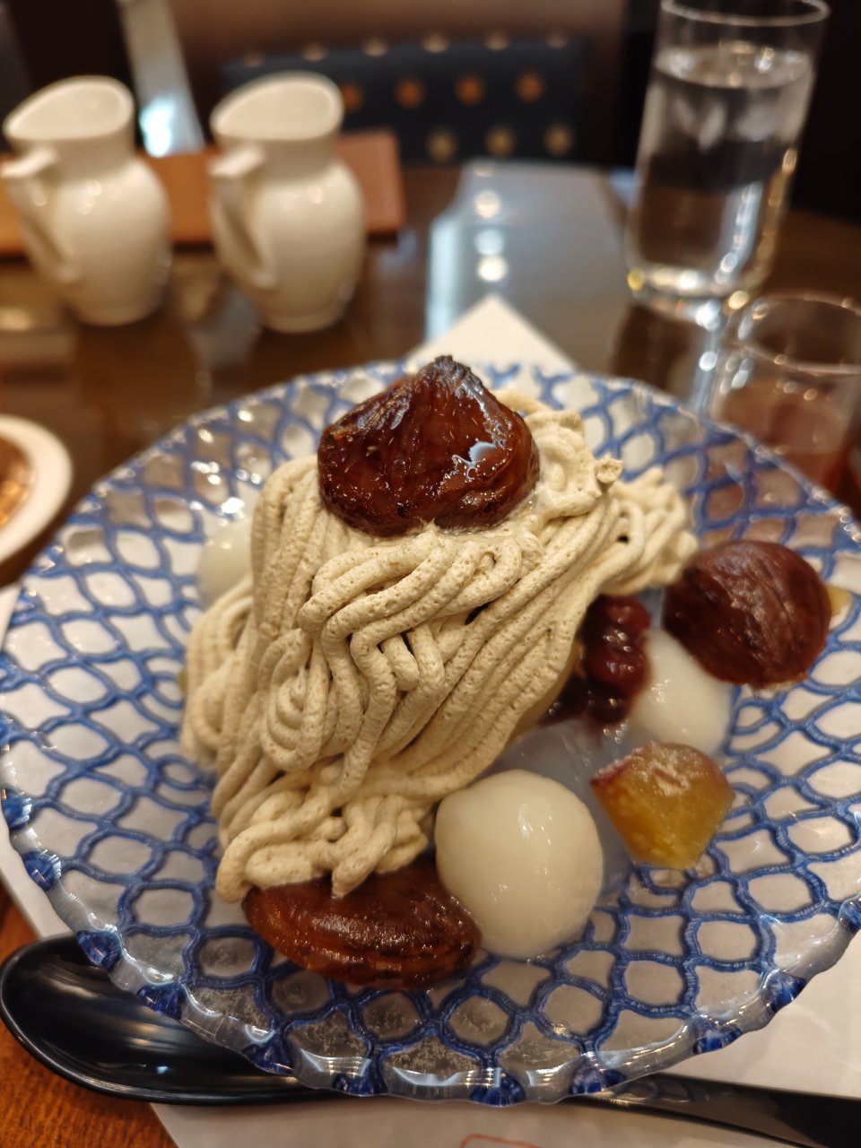 あんみつの上に栗のアイスがのっててさらにその上にモンブランふうのクリームがかけられてます。