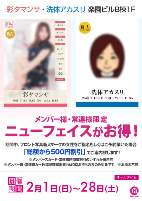 期間中、フロント写真新人マークの女性をご指名もしくはご予約頂いた場合「総額から500円割引」でご案内致します! ※メンバーズカード・常連様時間帯割引のいずれか併用可 ※メンバー様・常連様カード(認証確認出来ればOK)お持ちの方のみ対象です ※本指名不可 |