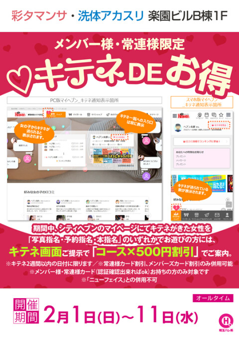 期間中、シティヘブンのマイページにてキテネがきた女性を「写真指名・予約指名・本指名」のいずれかでお遊びの方には、キテネ画面ご提示で「コース×500円割引」でご案内。 ※キテネ2週間以内の日付に限ります ※常連様カード割引、メンバーズカード割引のみ併用可能 ※メンバー様・常連様カード(認証確認出来ればok)お持ちの方のみ対象です ※「ニューフェイス」との併用不可 |