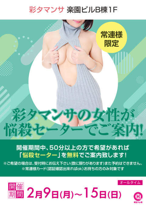 開催期間中、50分以上の方で希望があれば「悩殺セーター」でご案内致します! ※ご希望の場合は、受付時にお伝え下さい(数に限りがあります)また予約はできません。 ※常連様カード(認証確認出来ればok)お持ちの方のみ対象です |