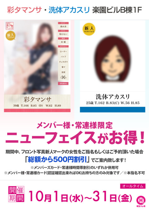 ![]() 期間中、フロント写真新人マークの女性をご指名もしくはご予約頂いた場合「総額から500円割引」でご案内致します! ※メンバーズカード・常連様時間帯割引のいずれか併用可 ※メンバー様・常連様カード(認証確認出来ればOK)お持ちの方のみ対象です ※本指名不可 |