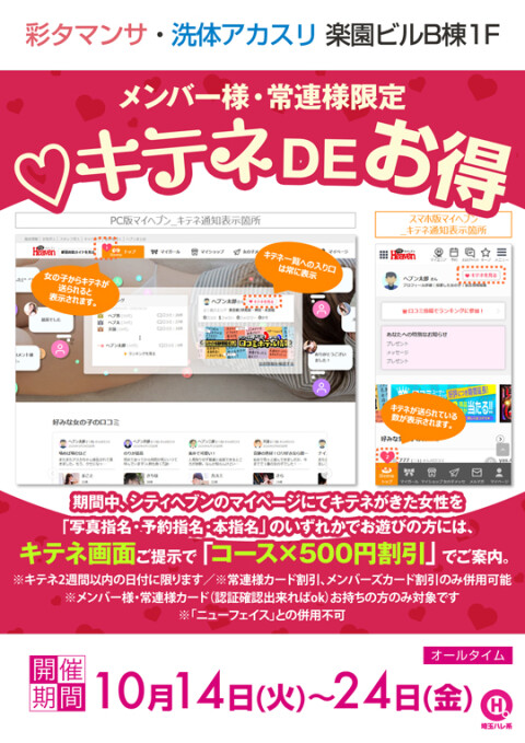 ![]() 期間中、キテネがきた女性を「写真指名・予約指名・本指名」のいずれかでお遊びの方には、キテネ画面ご提示で「コース×500円割引」でご案内。 ※キテネ2週間以内の日付に限ります ※常連様カード割引、メンバーズカード割引のみ併用可能 ※メンバー様・常連様カード(認証確認出来ればok)お持ちの方のみ対象です ※「ニューフェイス」との併用不可 |