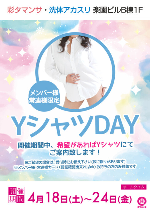 開催期間中、希望があればYシャツにてご案内致します! ※ご希望の場合は、受付時にお伝え下さい(数に限りがあります) ※メンバー様・常連様カード(認証確認出来ればok)お持ちの方のみ対象ですの方のみ対象です。 |