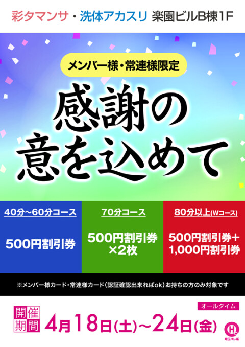 40分〜60分コース:500円割引券 70分コース:500円割引券×2枚 80分以上(Wコース):500円割引券+1,000円割引券 ※メンバー様カード・常連様カード(認証確認出来ればok)お持ちの方のみ対象です |