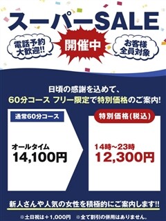 【通常60分コース】 オールタイム 14,100円 ↓ ↓ ↓ 【特別価格(税込)】 14時〜23時 12,300円
