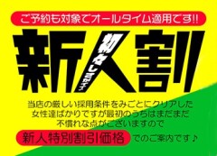 ~当店を初めてご利用される方~ 55分 70分 85分 100分 130分 180分 入会金・写真指名料込み ※ もちろん事前ご予約もOK。 ※ ご予約時に『新規割』とお伝えください。 |