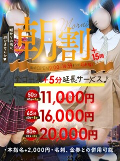☆新規様オールタイム5,000円割引☆ 『ご新規様はお得!!』 ご新規様は12時以降で5,000円引!! 入会金&写真指名料込み 45分・・・¥13,000!! 60分・・・¥17,000!! 75分・・・¥21,000!! 更に!次回どの割引とも併用可能な2000円金券チケット配布! 更に!会員証をお持ち帰りの方は次回1,000円OFF! 午前中もお得な料金でご案内中♪ 9:00~14:59はサービスタイム! 『あさ割+5プラス』50分11,000円~の破格料金でご案内♪ さらにオールタイム写真指名無料! 写真見学し放題! 御新規様も会員様も、どうぞ安心してお気軽に写真見学&お問い合わせお待ちしております。 http://www.okubo-seifuku.com/ http://www.okubo-seifuku.com/sp/ 【営業】9:00~24:00 03-3363-7716 |